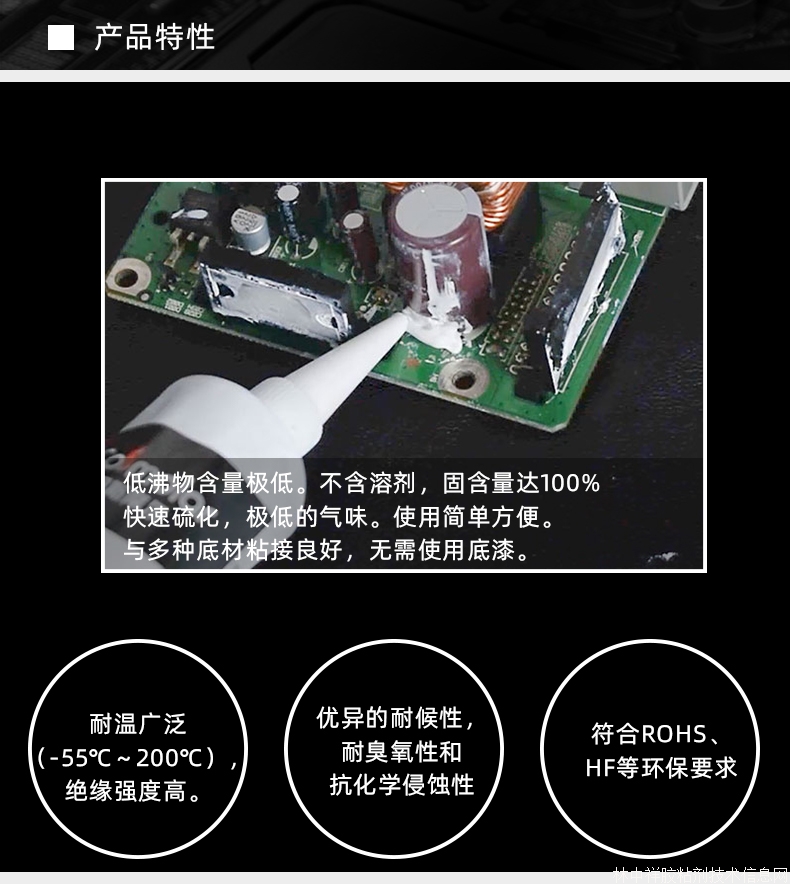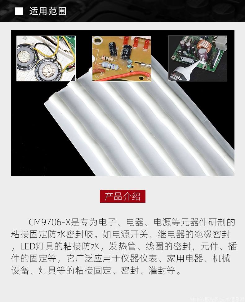 CM9706是專為電子、電器、電源等元器件研制的粘接固定防水密封膠。如電源開關、繼電器的絕緣密封,LED燈具的粘接防水,發熱管、線圈的密封,元件、插件的固定等,它廣泛應用于儀器儀表、家用電器、機械設備、燈具等的粘接固定、密封、灌封等。