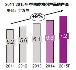 過去的幾年里,我國膠粘劑和密封劑的產量和銷售額均呈現高速增長的趨勢,產量的年均增長率達9%。根據今年9月召開的膠粘劑年會,協會與業內專家普遍認為在“十三五”期間,我國膠粘劑的產量仍將爆出年均7.8%的增長,在2020年末實現1033.7萬噸的產量。相對于新常態下6.5%的GDP,我們還是有理由堅定看好膠粘劑行業的。
