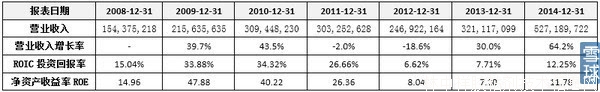 從披露的2008年至2014年末營業收入看, 平均增速26.1%(幾何平均增速為23.2%) ,近三年平均增速25.2%(注:以下近三年均指2012-2014年) 。ROIC平均增長率19.5%,近三年平均增長率8.86%。盡管募集資金使得凈資產增厚,但自上市以來ROE降幅仍舊過大,2013年降到最低,14年開始有所增長,15年三季報已恢復到17.87%,趨勢看,向好。