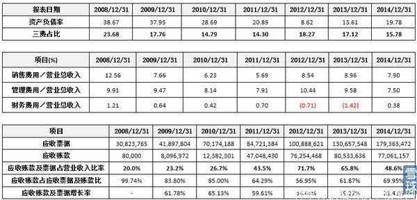 結合應收賬款及票據占比來看,近3年平均占比營業收入17.6%,而近三年平均增速達到了25%,可以說是達到了與近三年營業額平均增速相當的地步!就應收款結構看,應收賬款的比例在14年末總應收款中比例高達69.95%,顯然不是個好的現象。快速擴張提升了授信及壓貨量,當然這也和公司主營業務是風電行業大客戶銷售模式有關,這也與風電行業近幾年較大波動有關,壞賬計提額度顯然不易降低,這使得公司的現金流入產生不利。