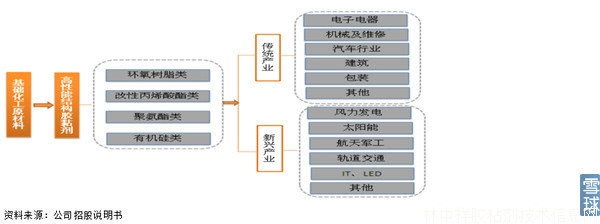 膠粘劑屬于精細化工品的專用化工品,通過膠粘劑可以實現同種或不同材料間的粘接或密封。行業生產商眾多競爭激烈,但其中結構膠粘劑屬于膠粘劑中的高附加值產品。康達新材主要從事結構膠粘劑研發、生產和銷售,擁有環氧樹脂膠、改性丙烯酸酯膠、聚氨酯膠、SBS膠等多種類型,下游應用有兩類,見下圖: