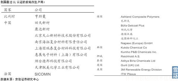 另一方面,風電用膠,有準入限制,風電葉片使用壽命應當大于20年,因此膠粘劑生產企業需要通過國際權威的德國勞氏認證(GL認證)以及用戶的測試和體驗,全球通過認證企業也僅為20多家,我國為7家。