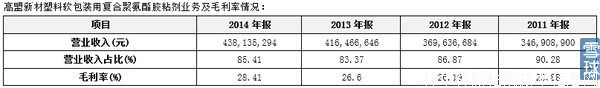 論塑料軟包裝用聚氨酯膠粘劑行業龍頭,應該是北京高盟新材,產能高達3.6萬噸,即使如此2015年市場占有率也不過7-8%,也從另一角度說明這一領域成長空間巨大。無論從產能、品類豐富、毛利率(近三年平均27.01%,明細見下表)、該領域耕作時間、客戶粘性等都強于康達新材。