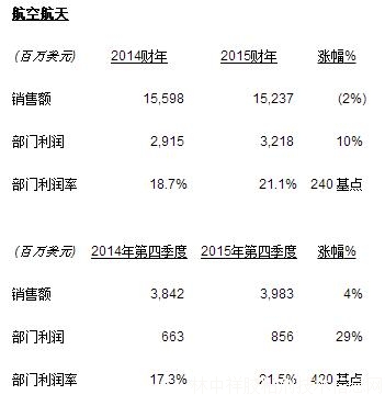 第四季度部門利潤(rùn)上升29%,部門利潤(rùn)率增長(zhǎng)420個(gè)基點(diǎn)至21.5%,這主要?dú)w功于2014年第四季度原始設(shè)備制造商激勵(lì)計(jì)劃、扣除通貨膨脹因素后的生產(chǎn)效率的提升以及商業(yè)優(yōu)化帶來(lái)的積極影響,被較高的商業(yè)原始設(shè)備交貨的利潤(rùn)率影響和持續(xù)的投資增長(zhǎng)部分抵消。去除2014年第四季度原始設(shè)備制造商激勵(lì)計(jì)劃的影響,部門利潤(rùn)上升1%,部門利潤(rùn)率增長(zhǎng)50個(gè)基點(diǎn)。