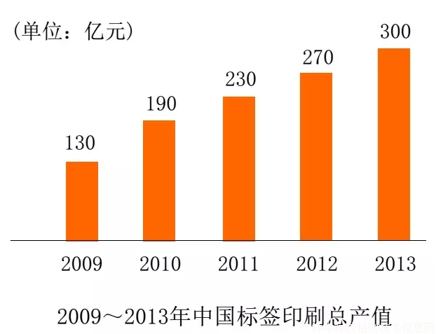 中國是全世界最大的市場,也是最大的標簽消費市場。中國的標簽行業尤其是不干膠標簽行業經過四十年的發展已經取得了巨大的成績。據“中國印刷及設備器材工業協會標簽印刷分會”的不完全統計,2009~2013年,我國標簽印刷總產值呈上升趨勢,如圖所示。2013年中國境內的不同類型的標簽印刷廠約6千多家,產值約300億人民幣,材料消耗總量約為100億平方米,其中不干膠材料涂布量約為40億平方米,其他為濕膠標簽或其他類型的標簽。不干膠材料40億平方米中出口量約占10%(包括材料和成品標簽),按全國13億人口計算,除去標簽加工過程中的損耗和排廢,人均消費量超過2平方米,也就是說2013年每人全年消費大約超過2平方米左右的不干膠標簽材料。