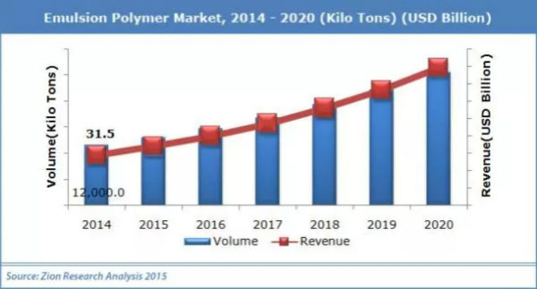美國市場研究公司Zion Research發布的報告稱,2014年全球乳液聚合物市場需求價值315億美元,到2020年將增至430億美元,在此期間的年復合增長率為6.0%,按數量計算,2014年全球乳液聚合物市場規模為1200萬噸。
