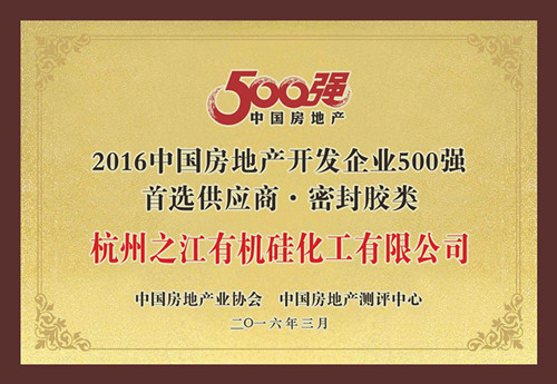 3月22日,由中國房地產業協會、中國房地產測評中心聯合主辦的2016年中國房地產500強測評成果發布會在北京國貿大酒店隆重舉行。備受關注的“2016中國房地產開發企業500強”測評成果及“2016中國房地產開發企業500強首選供應商品牌”測評成果在會中發布,杭州之江有機硅化工有限公司再次獲得中國房地產開發企業500強密封膠首選供應商榜單第一名。