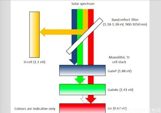 這種太陽能電池有三層,各自對應不同的光波,能夠最有效地利用光能,而剩下的光能會傳遞到下一層、最終紅外光波會被篩出反彈到硅光電池那邊。