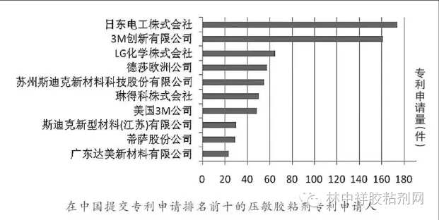 筆者統(tǒng)計(jì)了在中國(guó)提交專利申請(qǐng)排名前十的壓敏膠粘劑專利申請(qǐng)人,發(fā)現(xiàn)前十位申請(qǐng)人的專利申請(qǐng)總量為692件,占我國(guó)申請(qǐng)總量的41.3%,這體現(xiàn)出壓敏膠粘劑領(lǐng)域較高的技術(shù)集中度。其中,日東電工株式會(huì)社以174件申請(qǐng)量居于榜首,3M創(chuàng)新公司以161件申請(qǐng)量緊隨其后,由此充分體現(xiàn)了日、美作為全球主要的壓敏膠粘劑生產(chǎn)國(guó)對(duì)中國(guó)市場(chǎng)的重視。此外,排名前十位的申請(qǐng)人中有3家中國(guó)企業(yè),表明國(guó)內(nèi)企業(yè)專利保護(hù)意識(shí)的提升,但3家公司相關(guān)專利申請(qǐng)中實(shí)用新型申請(qǐng)占比較高,可見(jiàn),國(guó)內(nèi)申請(qǐng)人亟需提升壓敏膠粘劑的科技創(chuàng)新意識(shí),加大科研力度,提高專利質(zhì)量。