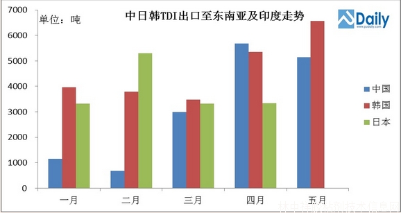 近兩個月,韓國貨源出口到該地區的TDI數量穩步上升,一定程度添補了三井留下來的一些空缺。據消息,目前巴斯夫德國裝置仍然處于停車狀態,韓國裝置在供給東南亞地區之外,還要調貨到歐洲。此外,據海關數據顯示,其中國裝置在5月份也抽調一批TDI前往歐洲地區,一定程度說明5月韓國裝置供應緊缺情況。
