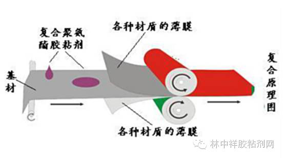 復合聚氨酯膠粘劑專指分子鏈中含有氨酯基(-NHCOO-)或異氰酸酯基(-NCO)類的膠粘劑,主要用于將兩種或以上不同或相同性質的膜狀、片狀材料粘接,形成新復合材料的膠粘劑。原理見下圖: