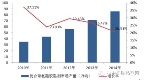 2009年以來,中國復合聚氨酯膠粘劑快速發展,產量以年均25%以上的速度持續增長。2013年、2014年,中國復合聚氨酯膠粘劑行業產量分別達到71.2萬噸、85.8萬噸,維持良好的增長勢頭。