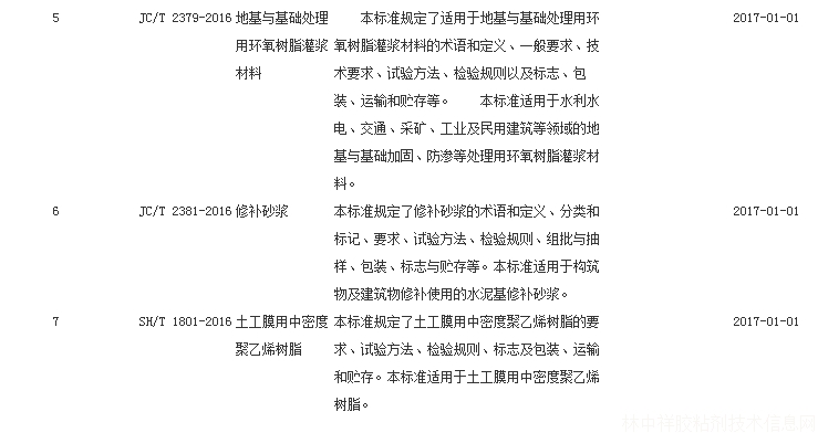 近日,工信部發布2016年第37號公告,批準了425項行業標準!毒垡蚁┍]防水卷材用聚合物水泥粘結料》、《建筑用防霉密封膠》等多項跟建筑防水與密封、保溫等相關的標準在列,實施日期均為2017年1月1日。詳情見下表: