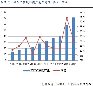 根據中國膠粘劑工業協會統計, “十二五”期間膠粘劑產量和銷售額的年平均增長率分別達到10%和12%,2015年我國膠粘劑的產量可達到717萬噸,銷售額1,038億元。工程膠粘劑是膠粘劑中的高附加值產品,技術含量、制造及使用條件均高于普通膠。隨著我國房地產、汽車、光伏、電子電器等行業發展,我國工程膠粘劑市場規模增長較快,到2015年我國工程膠粘劑產量和銷售額將分別達到73萬噸和230億元,比2010年平均每年增長17.3%和18.8%。