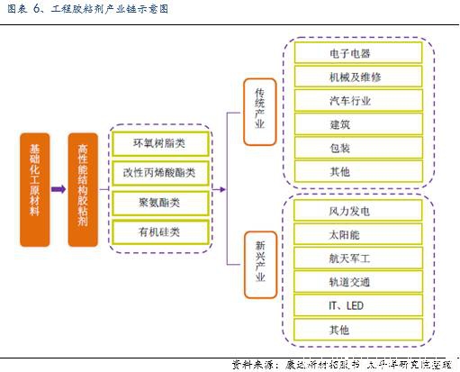 工程膠粘劑是膠粘劑的高端產品,指用于受力結構件膠接的,能長期承受使用應力、環境作用的膠粘劑,和其他膠粘劑相比,具有強度高、耐疲勞、耐老化等優點,主要為反應型膠粘劑。結構膠粘劑的化學類型主要有:環氧樹脂膠、丙烯酸酯膠、厭氧膠、高性能聚氨酯膠、高性能有機硅膠。作為替代傳統連接技術的新材料,結構膠粘劑無論是在傳統產業還是新興產業中都得到了廣泛應用。