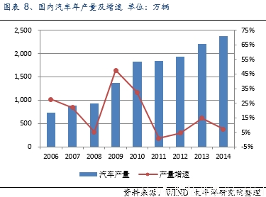 我國汽車市場經歷了10多年的高速增長后,受金融危機、部分城市限購政策的影響,2011、2012年增速放緩,2013、2014年銷量增速出現回升,截止2014年底我國汽車保有量達到1.54億輛,位居世界第二。進入2015年,國內汽車產銷量增速放緩,1-9月合計產量為1,709萬輛,同比減少0.82%,1-9月合計銷量1,705萬輛,同比增長0.31%,為進一步刺激汽車市場, 國務院于9月30日出臺財稅政策:“從2015年10月1日到2016年12月31日,對購買1.6升及以下排量乘用車實施減半征收車輛購置稅的優惠政策。”,同時進一步放開新能源汽車的限購政策,我們預計未來五年國內汽車年平均產量仍可以維持在2,400萬輛左右,汽車整車用膠粘劑需求穩健增長。