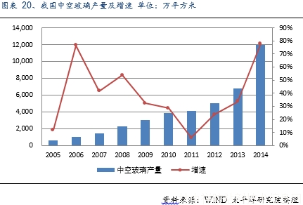 建筑節能減排是節能減排的重要內容,節能門窗的保溫隔熱和密閉技術是我國鼓勵發展的重點節能技術之一,隨著節能減排目標實施的推進,中空玻璃市場需求量巨大,2014年我國中空玻璃產量12,009萬平方米,同比增長77.93%,中空玻璃產量的快速增長將有效帶動中空玻璃密封膠的需求。