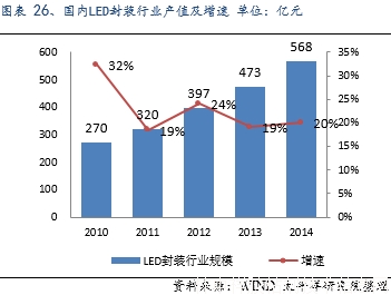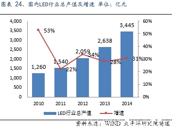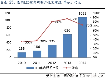 近年來電子電器領域實現較快發展,2014年集成電路產量達到1,035億塊,同比增長19.4%; 我國LED行業總產值達3,445億元,同比增長30.6%,主要是LED室內照明需求的明顯提升所致,其2014年產能達到1,082億元,同比大增72.8%;LED 封裝行業2014產值達到568億元,同比增幅為20.1%。隨著國家對LED節能照明產業的政策扶持力度加大,預計電子電器領域用膠未來可保持年均20%以上增長。