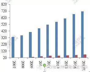 圖:2007-2015年中國膠粘劑和熱熔膠產量統計(單位:萬噸)