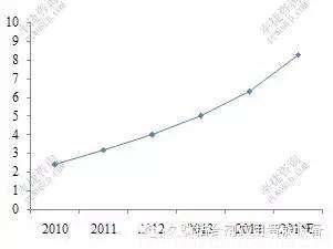 圖:2010-2015年中國TPU熱熔膠膜市場規模增長趨勢(單位:億元)