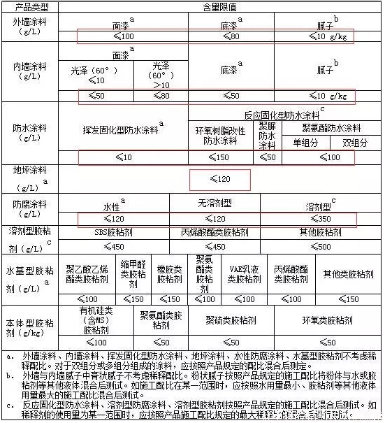 3.外墻與內墻膩子為產品不扣除水分的揮發性有機物含量,以克每千克(g/kg)表示。