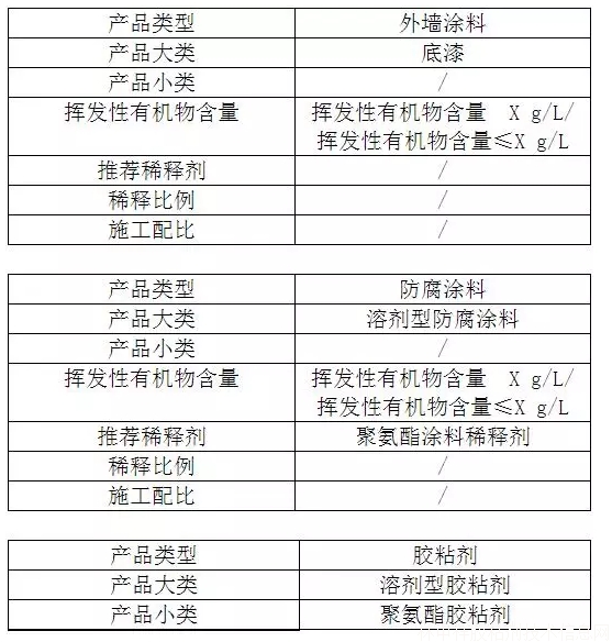 3.對于施工時需要稀釋的產品,則須顯示推薦的稀釋溶劑和稀釋比例(對于用水稀釋的建筑類涂料或膠粘劑無需說明)。對于由雙組分或多組分配套組成的產品,則須顯示各組分的施工配比。