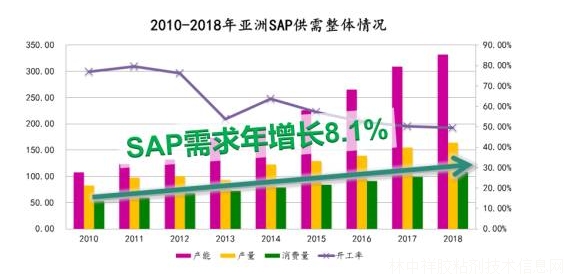 截至目前,亞洲SAP年產能約265萬噸,產量140萬噸,消費量90萬噸。