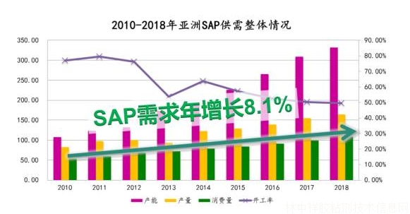 2012年-2016年,亞洲市場產能呈暴發態勢擴增,整體開工率由80%迅速降至50%附近,SAP供應大于需求的格局加劇明顯;