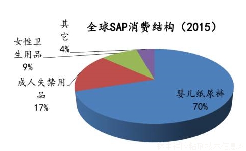 2015年,全球SAP消費結構主要包括嬰兒紙尿褲、成人失禁用品、女性衛生巾及其它領域(醫療、農林保水、工業防水、食品保鮮等),其中,嬰兒紙尿褲為最大消費領域,消耗約70%SAP總量