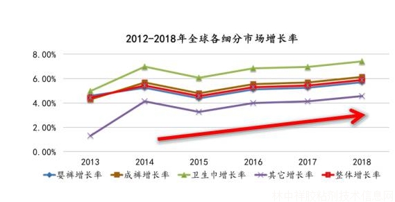 2012-2018年,全球嬰兒尿褲年增長5.05%,成人尿褲年增長5.36%,女性衛生巾年增長6.54%;