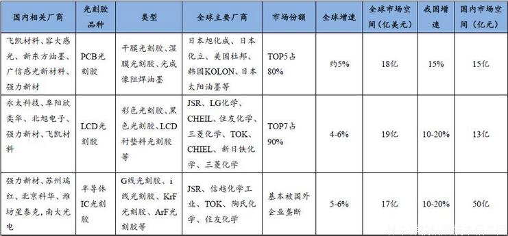 LCD光刻膠競爭格局:目前主要包括彩色光刻膠和黑色光刻膠,是LCD制造業的關鍵上游材料,其技術壁壘極高,幾乎被數家日本、韓國廠商所壟斷,近幾年韓國及臺灣的個別廠商才開始進入。其所用的專用化學品如顏料、光引發劑、樹脂等原料,性能要求特別,品質要求苛刻,彩色光刻膠主要生產商有JSR、LG 化學、CHEIL、TOYOINK、住友化學、奇美、三菱化學,占全球產量超過90%;近幾年,臺灣達興、新應材逐步進入彩色光刻膠行產業。黑色光刻膠行業的集中度更高,主要生產商 TOK、CHEIL、新日鐵化學、三菱化學、ADEKA,占全球產量超90%。中國在該領域目前處于起步發展階段。