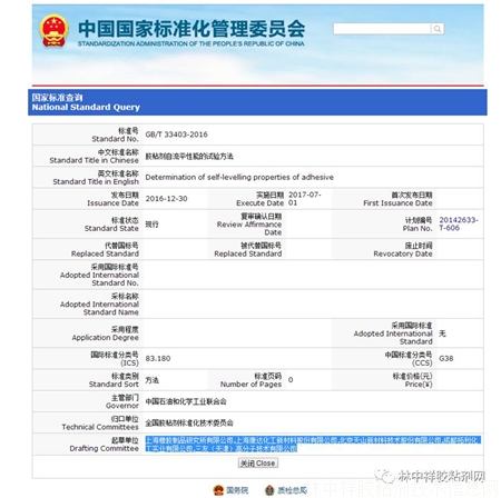 經(jīng)國家質(zhì)量監(jiān)督檢驗(yàn)檢疫總局、國家標(biāo)準(zhǔn)化管理委員會批準(zhǔn),根據(jù)國標(biāo)委2016年第27號公告,12月30日GB/T 33403-2016 《膠粘劑自流平性能的試驗(yàn)方法》正式發(fā)布,標(biāo)準(zhǔn)計(jì)劃編號:20142633-T-606。