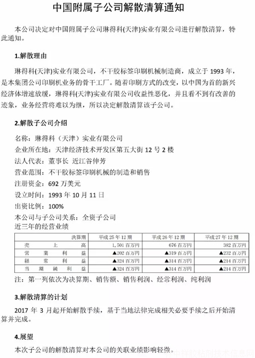 2017年3月1日,日本琳得科株式會社官網公布了對中國附屬子公司琳得科(天津)實業有限公司進行解散清算的通知(詳情見琳得科官網:http://www.lintec.co.jp/)。原文如下:
