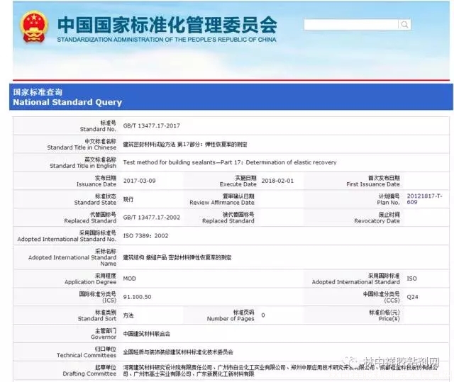 經國家質量監督檢驗檢疫總局、國家標準化管理委員會批準,根據國標委2017年第5號公告,3月9日GB/T 13477.17-2017《建筑密封材料試驗方法 第17部分:彈性恢復率的測定》正式發布,標準計劃編號:20121817-T-609,代替國標號GB/T 13477.17-2002。