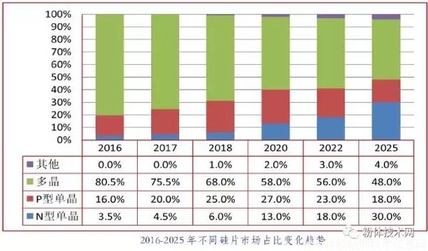 隨著光伏市場的不斷發展,高效電池將成為市場主導,單晶硅電池市場份額將會逐步增大,預計到2025年達到48%,其中N型單晶硅電池的市場份額由2016年的3.5%提高到2025年的30%,而多晶硅電池的市場份額將由2016年的80%下降到2025年的48%。