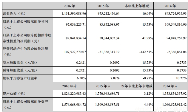 3月28日,回天新材(300041)發布2016年年報,公司2016年1-12月實現營業收入11.32億元,同比增長16.04%,化學制品行業營業平均收入增長率為22.09%;歸屬于上市公司股東的凈利潤9703.92萬元,同比增長15.73%,化學制品行業平均凈利潤增長率為5.96%。