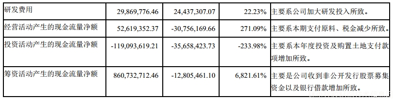 經營活動產生的現金流量凈額 5,261.94 萬元,較上年同期增長271.09%,主要系本期支付原料、稅金減少所致;投資活動現金流量凈額為-11,909.36萬元,較上年同期下降233.98%,主要系本期投資及購置無形資產支付款項增加所致;籌資活動現金流量凈額為86,073.27萬元,較上年同期增長6,821.61%,主要是公司收到非公開發行股票募集資金以及銀行借款增加所致。