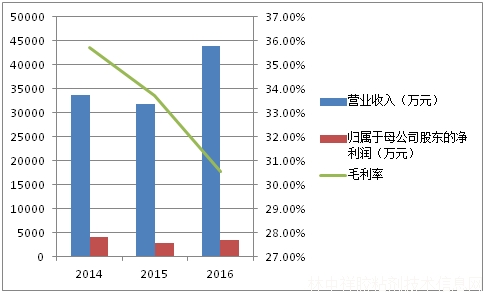 從公司IPO申報稿披露的近3年經營情況來看,雖然營業收入整體呈現出上升的趨勢,從2014年末的33609萬元增長至2016年末的43988萬元,但歸屬于母公司股東的凈利潤卻從2014年末的4042萬元下降至2016年末的3390萬元,如果扣除非經常性損益之后,同樣是呈現下降趨勢,由2014年末的3338萬元下降至2016年末的2657萬元。這主要是由于公司近3年的毛利率持續下滑所致,數據顯示,2014年-2016年公司綜合毛利率分別為35.73%、33.72%和30.54%。