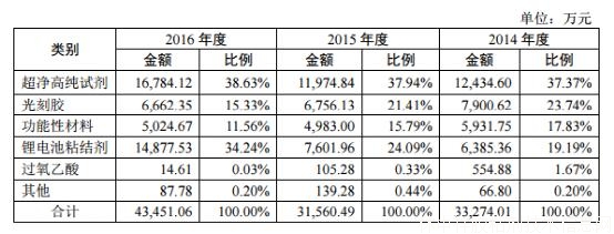 具體到公司各項主營業務近3年的變動情況,界面新聞發現:超凈高純試劑營收絕對金額有所上升,營收比例基本保持不變;光刻膠與功能性材料的營收絕對金額有所下滑,營收比例則持續下滑;而鋰電池粘結劑無論是營收的絕對金額還是相對比例均呈現持續上升的態勢,分別由2014年的6385萬元和19.19%上升至2016年的14878萬元和34.24%。