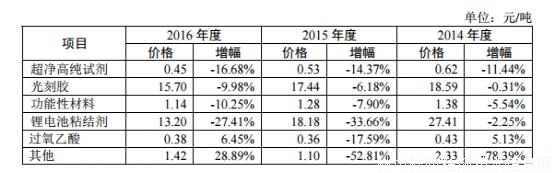 蘇州晶瑞各主營業務近3年價格變動情況