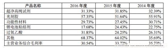 蘇州晶瑞各項主營業務近3年毛利率情況