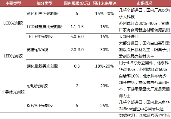 從市場規模角度來說,根據之前相關機構的預測,國內半導體光刻膠市場規模在7億元,而LCD以及LED光刻膠的規模大致在15億元左右。