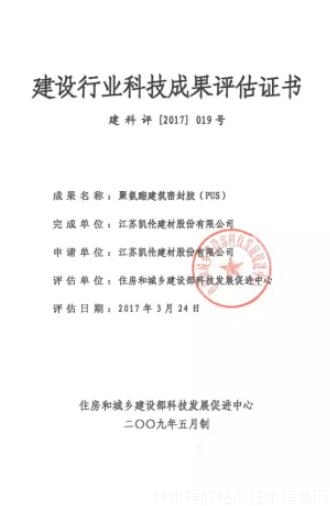 2017年3月24日,住房和城鄉(xiāng)建設(shè)部科技發(fā)展促進(jìn)中心在北京主持召開(kāi)了由江蘇凱倫建材股份有限公司研發(fā)的“聚氨酯建筑密封膠PUS”科技成果評(píng)估會(huì)。