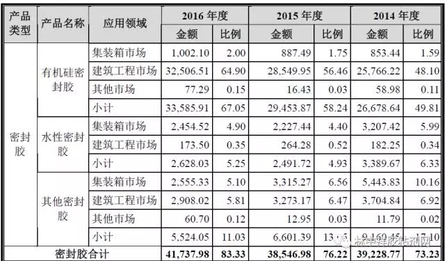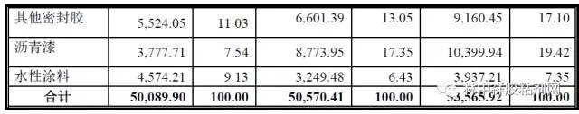 報告期內(nèi),對公司主營業(yè)務(wù)收入的貢獻(xiàn)度依次為有機(jī)硅密封膠、瀝青漆、其他密封膠、水性涂料和水性密封膠。