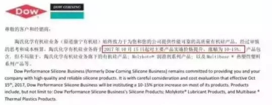 筆者從道康寧經銷商和瓦克官網了解到,道康寧主要有機硅產品實施價格上調,上調幅度為10%-15%,將于10月15日起執行。