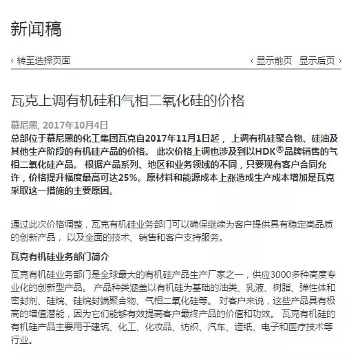瓦克官網顯示:瓦克自2017年11月1日起,上調有機硅聚合物、硅油及其他生產階段的有機硅產品的價格。 此次價格上調也涉及到以HDK®品牌銷售的氣相二氧化硅產品。 根據產品系列、地區和業務領域的不同,只要現有客戶合同允許,價格提升幅度最高可達25%。