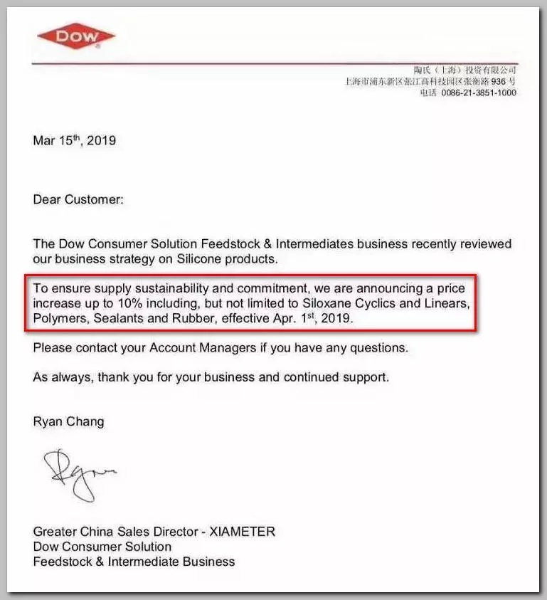 重磅!陶氏宣布全面上調(diào)硅氧烷、密封膠、聚合物價格!漲幅高達(dá)10%
