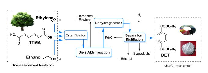 粘康酸可通過葡萄糖和木質素等發酵制得,其分子結構中含有一個共軛雙鍵和兩個羧基,與PTA分子相比,需要引入兩個碳原子來構建苯環。但是,由于粘康酸的溶解性較差,且分子結構中兩個吸電子的羧基使得粘康酸與乙烯的Diels-Alder反應難以直接進行。為解決上述問題,研究人員引入關鍵的粘康酸與乙醇的酯化反應,產物二酯在醇中的溶解性較好,且酯基的吸電子能力弱于羧基,相比于粘康酸,更易與親雙烯體發生Diels-Alder反應。經過串聯的酯化、環加成和脫氫反應后,對苯二甲酸二乙酯的總收率可達80.6%,并且產物可通過常用的蒸餾過程分離純化,從而實現了不經過PX直接生成PTA衍生物的新技術路線。該研究為優化利用生物質基原料中已有的組成和特殊結構,制備高附加值的化合物提供了可能。