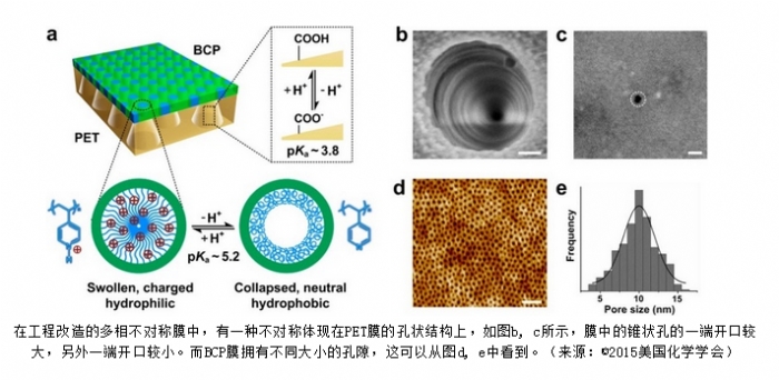 研究人員將這種新型膜稱為“工程改造的多相不對稱膜”。“工程改造”指的是,將使用在活體器官上的易碎性細胞膜進行改性,使其變得牢固耐用;“不對稱”是因為該膜兩側對離子的篩選有所不同;“多相”是因為膜兩側是由不同的材料組成,這里研究人員使用了兩種高分子材料:嵌段共聚物(BCP)和聚對苯二甲酸乙二醇酯(PET)。雖然并不是所有不對稱膜都是多相的,但是相比于使用單一材料制造的不對稱膜,多相膜擁有一些絕對的優勢,比如易于制造以及擁有極強的多功能性。