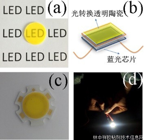 (a)熒光陶瓷片,(b)光轉換透明陶瓷封裝示意圖,(c)封裝透明陶瓷的LED燈珠,(d)演示透明陶瓷型LED燈珠白光轉換效果。